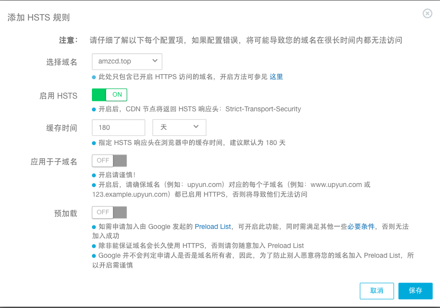 - 应用于子域名:开启此选项后,该域名的所有子域名从今往后都必须用 https 访问。如果您仍有站点使用 http 协议,千万不要开启!