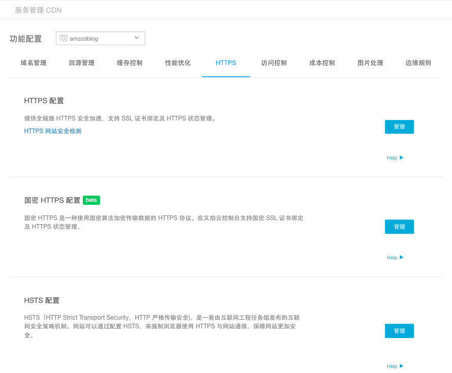 在又拍云 CDN 控制台中,找到 HTTPS -> HSTS 配置。