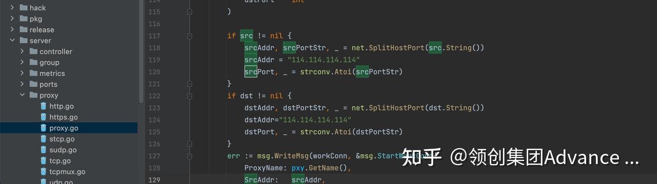如果不开启 TLS 选项的话,避免配置代理时暴露服务器 IP 和本机IP 的话,修改 server/proxy/proxy.go 文件。把源地址和目的地址写死114.114.114.114,这里可以任意修改。